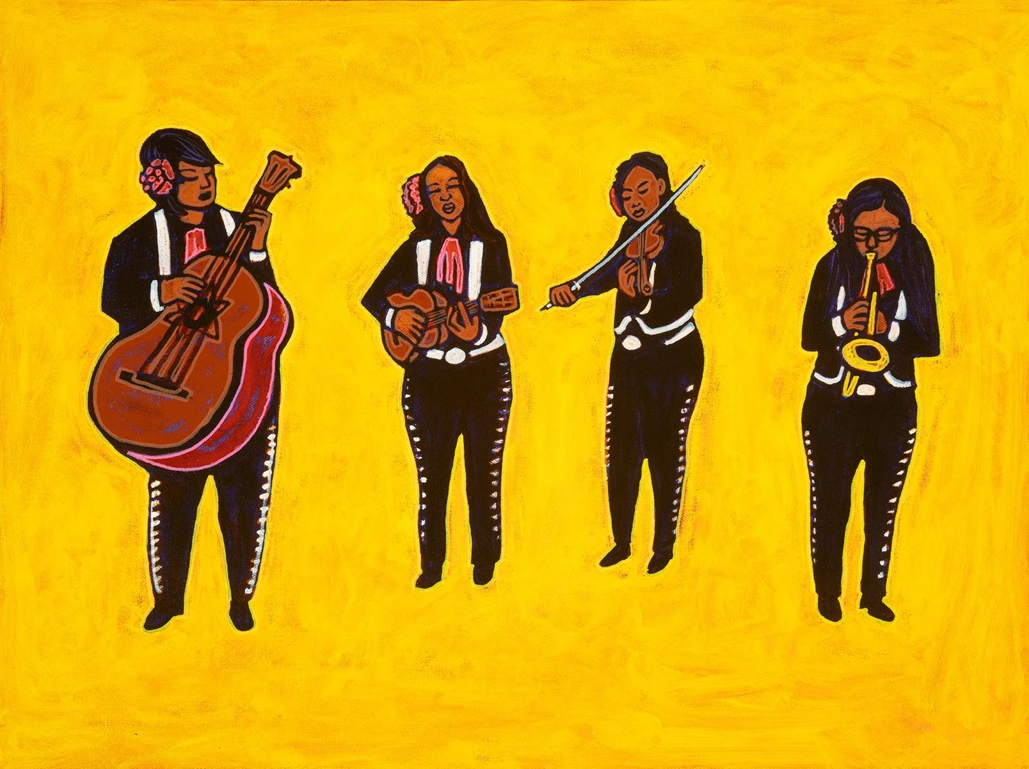 mariachis, 2024, acrylics and enamels on canvas, 16x12"